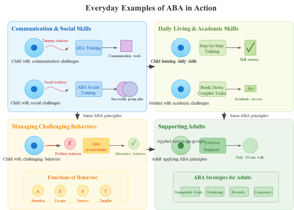While ABA is often associated with autism therapy, its strategies apply to daily life for anyone trying to learn or change behavior. Here are relatable ABA therapy examples: